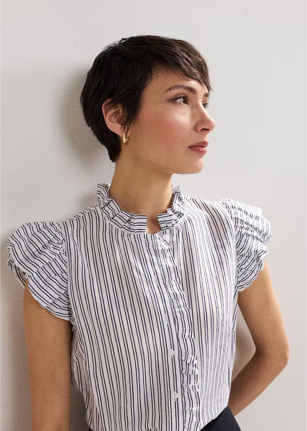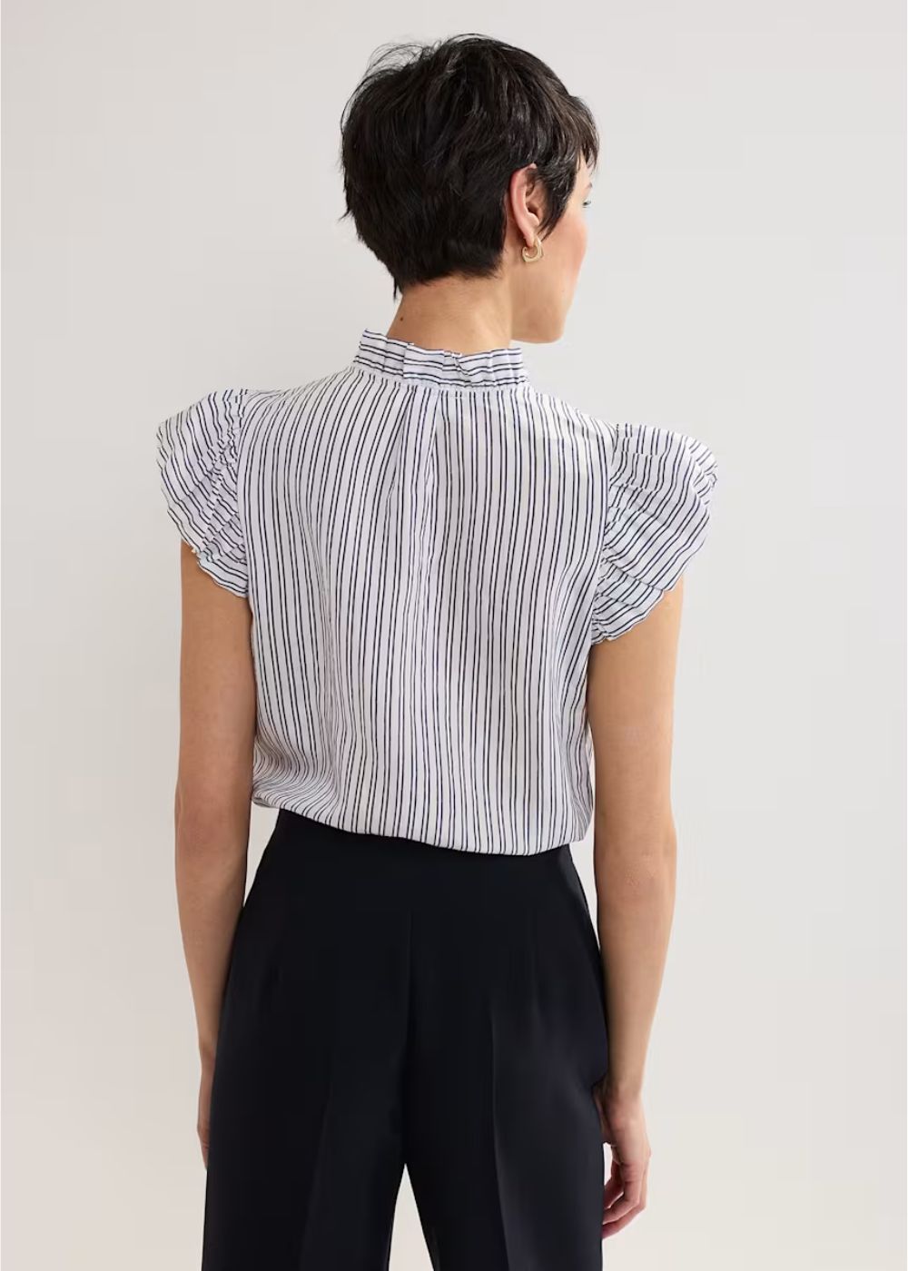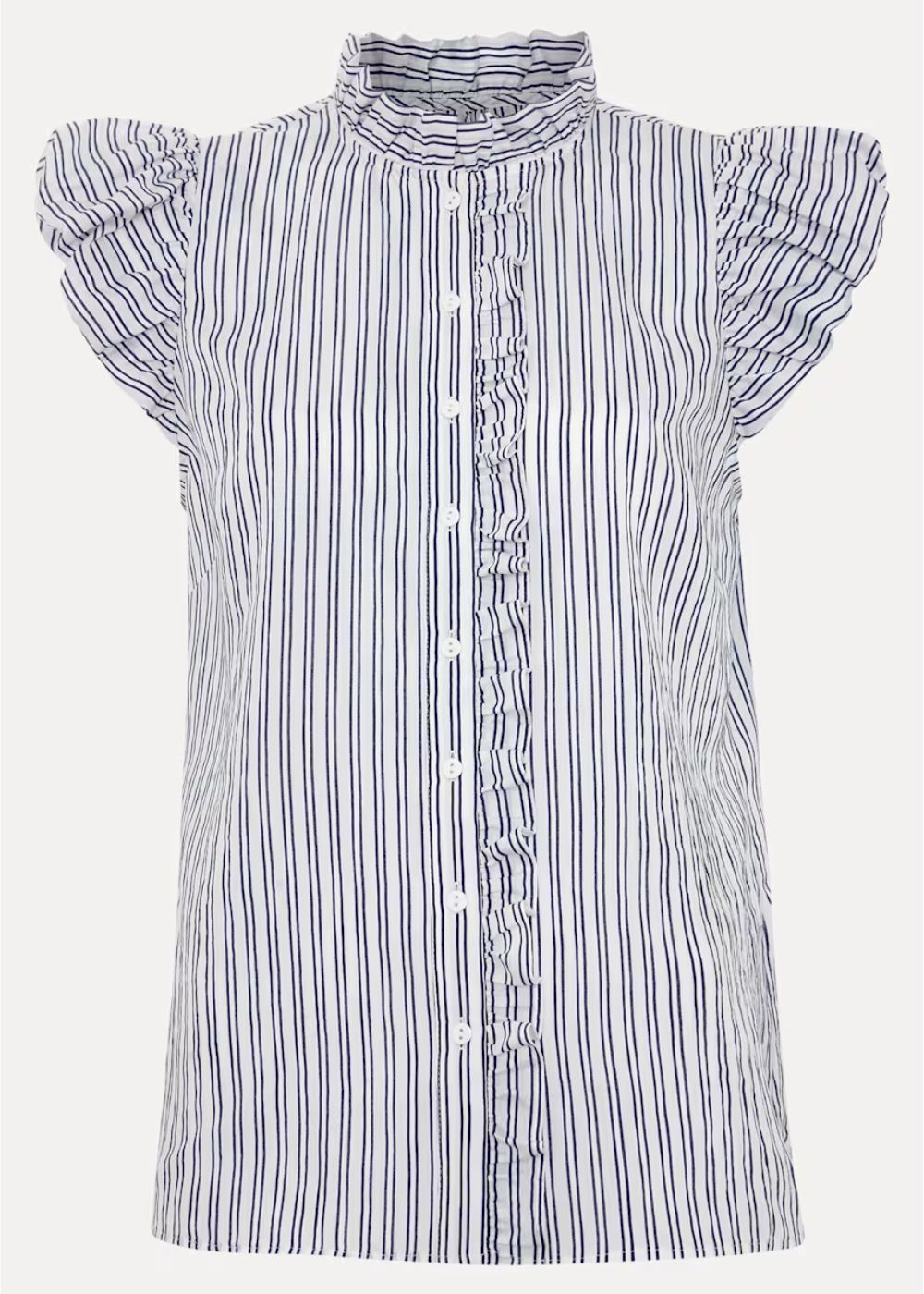 Our contemporary update on the classic stripe shirt. Frill detailing throughout provides a feminine edge whilst the sleeveless silhouette makes it perfect for warmer days styled with casual trousers and flats.