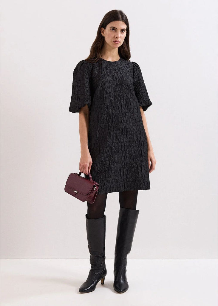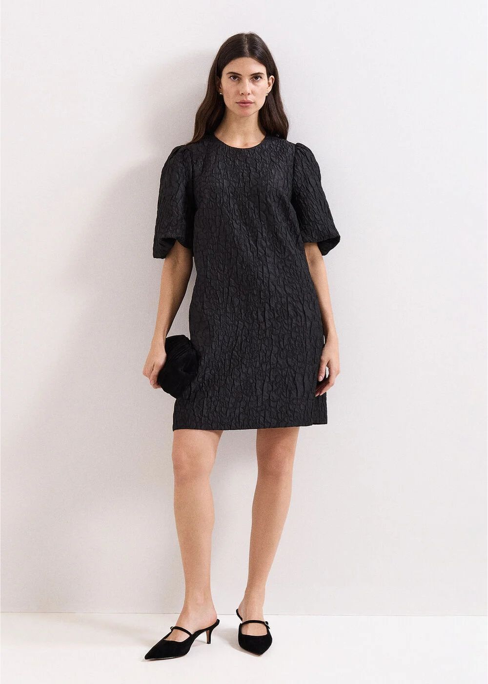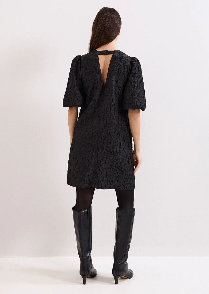 The perfect little black dress to add to your capsule wardrobe this season. Designed in a contemporary black jacquard fabric for refinement and structure, this LBD features playful puff sleeves and V shape back detail with embellished button fastening. Pair with your favourite heels and clutch for a party-ready style you’ll be reaching for again and again.