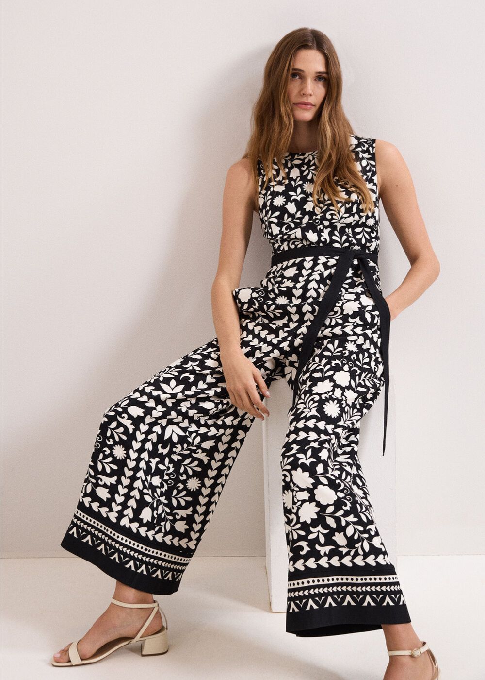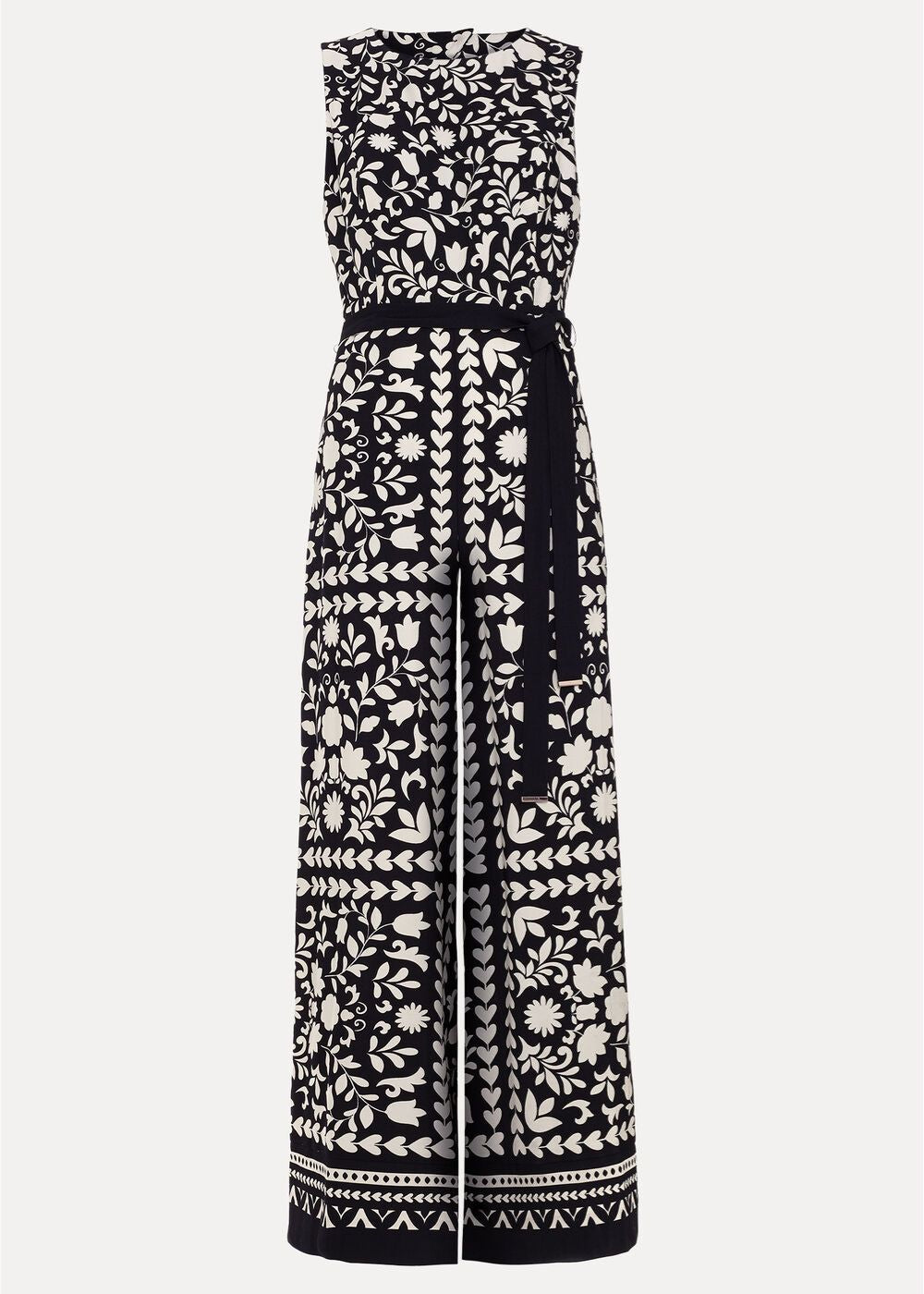A monochrome style with a playful edge. In a modern wide-leg silhouette, this black and white jumpsuit is designed in an abstract floral pattern and features comfortable shirring and a chic cut-out detail to the back. With a matching tie belt to add further shape, it’s the perfect jumpsuit for versatile styling, whatever your plans.