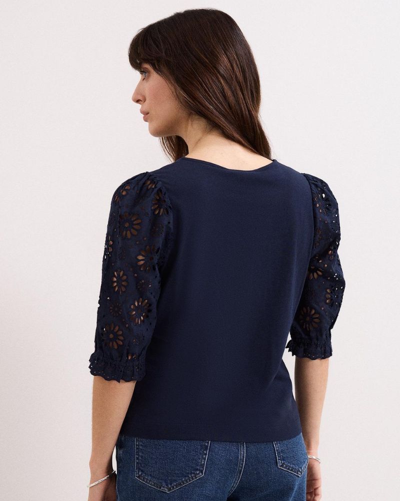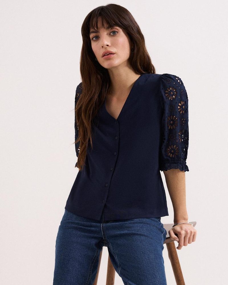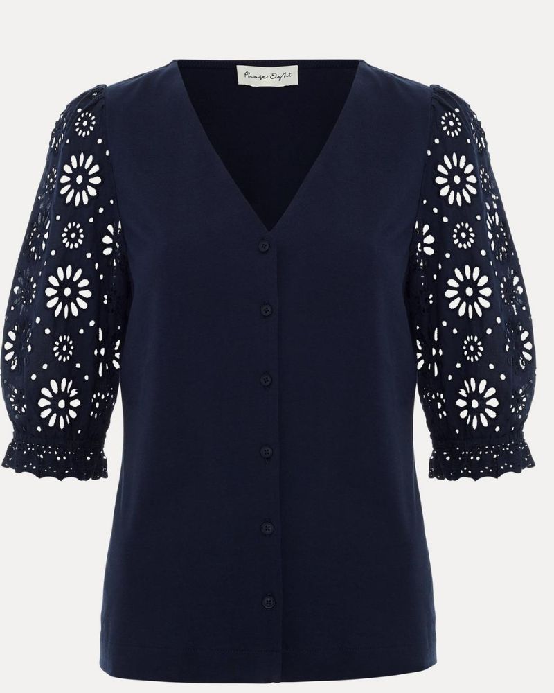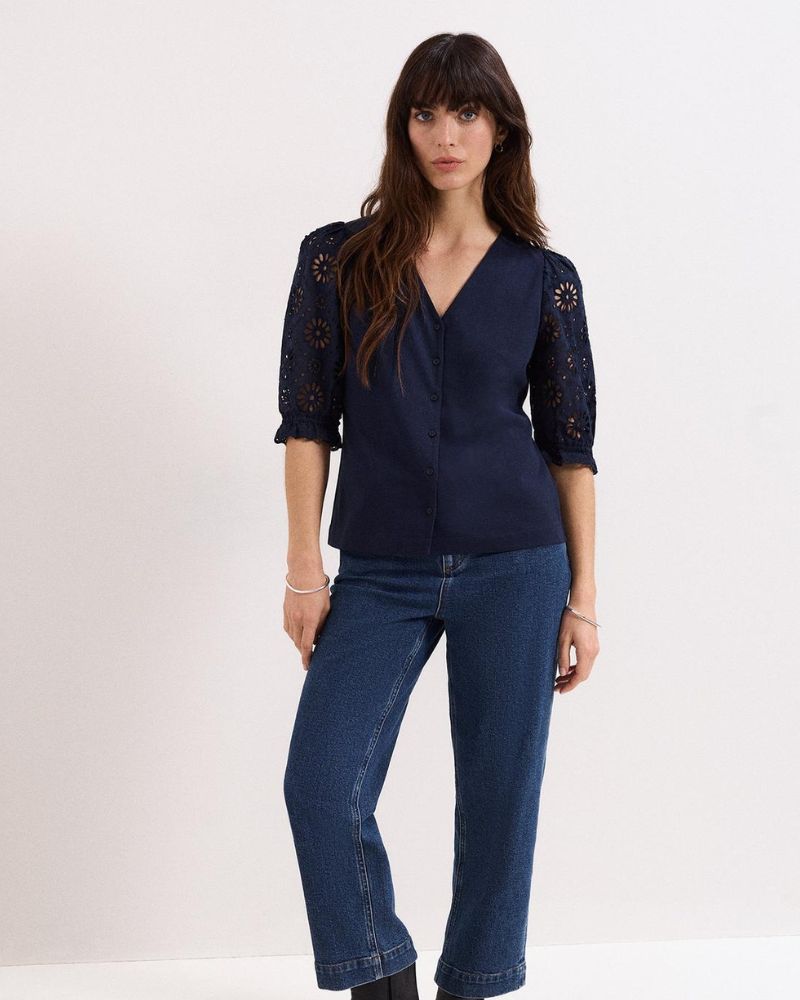 Your new go-to top for work and weekends. Designed in an easy-to-wear navy, this top features a feminine V neckline and floral cut-out details on the ¾ length sleeves for a modern touch. Style with your favourite jeans or trousers for a relaxed, but stylish look.
