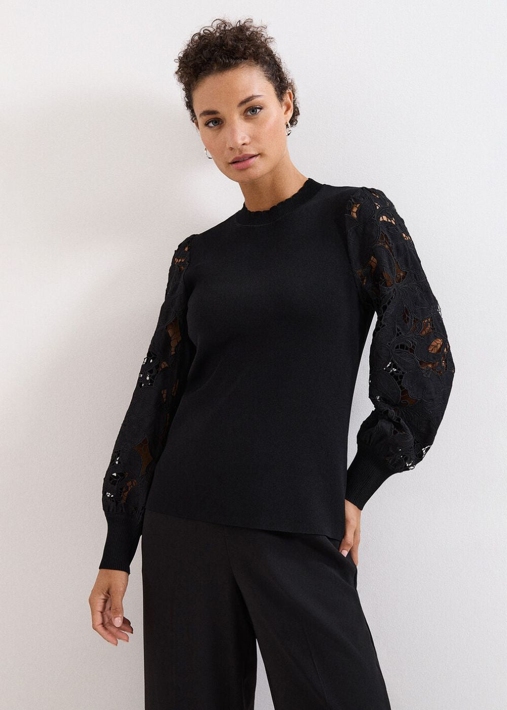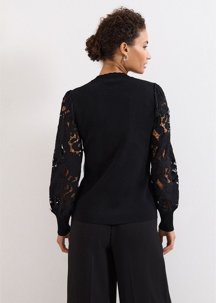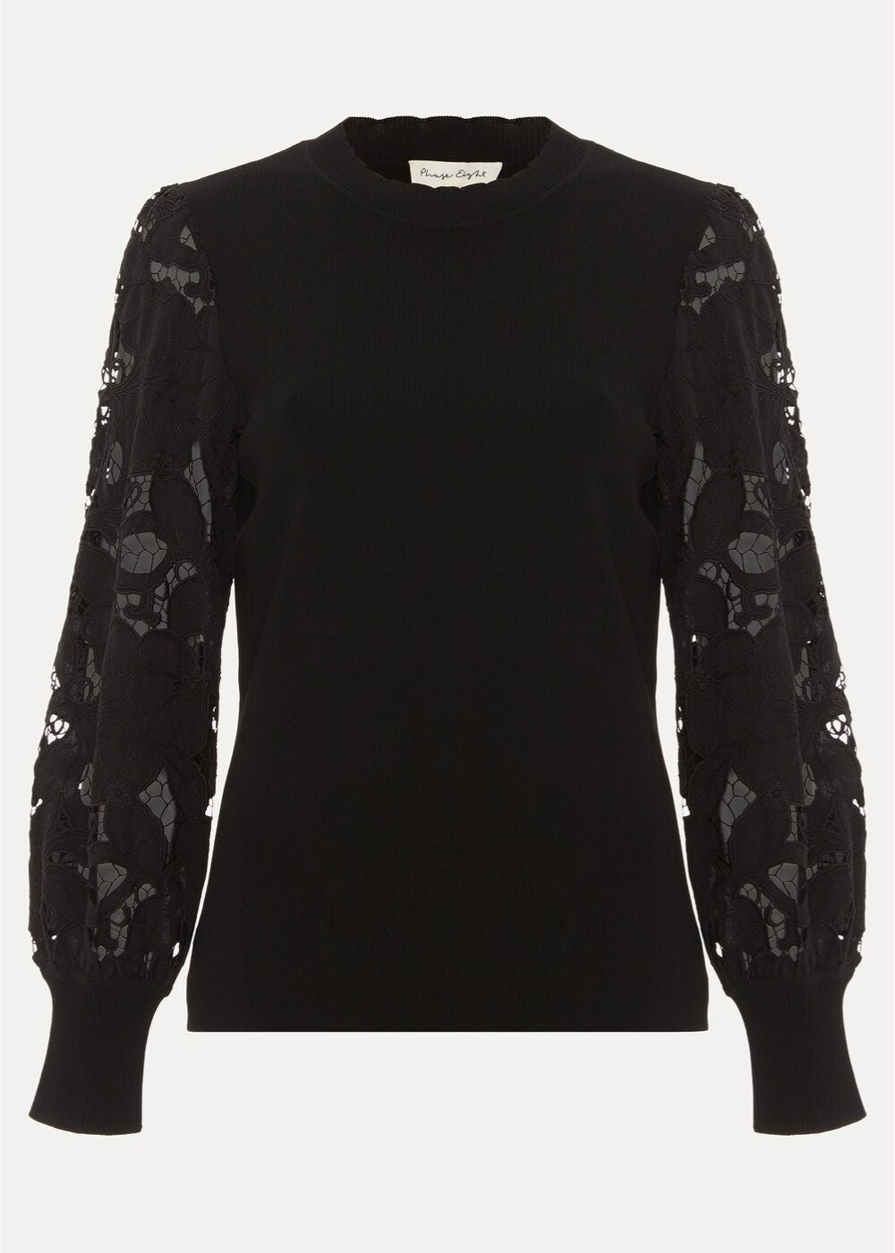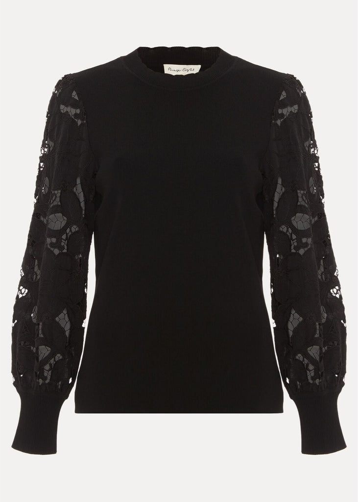 This black jumper is the true definition of an office to weekend style. Featuring intricate lace blouson sleeves and a soft scallop neckline, it’s a modern update on your must-have black knit. Designed with versatility in mind, pair with trousers, jeans and skirts for all your seasonal plans.