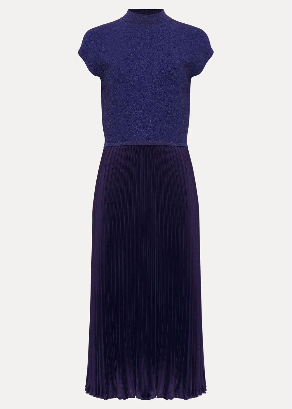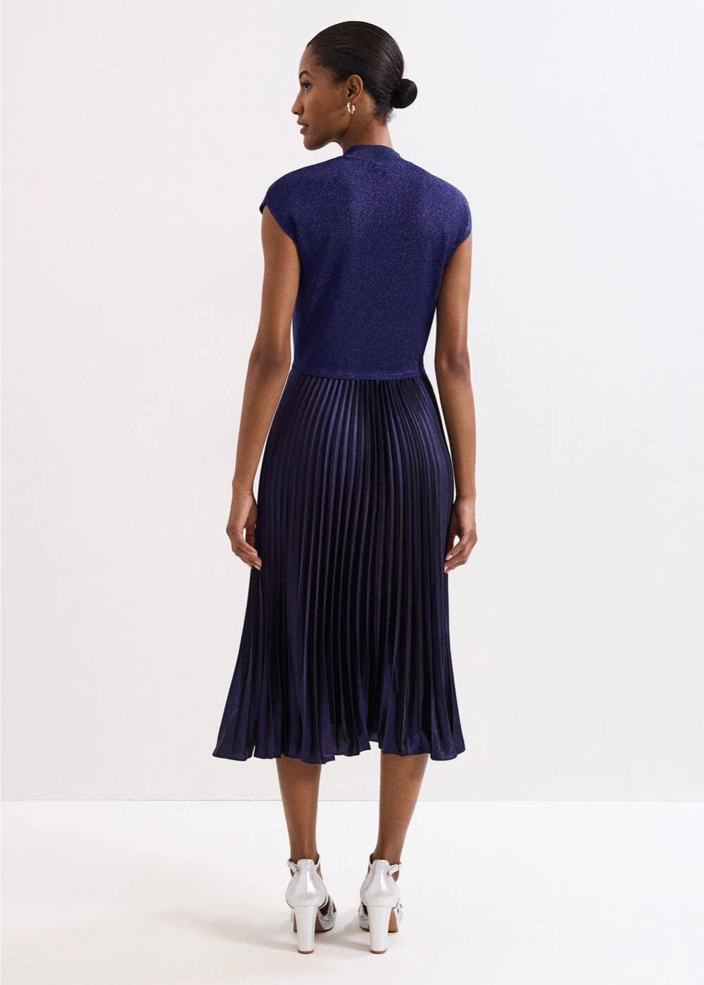 Designed in a new gorgeous blue, our midi dress is perfect for all manner of occasions. Featuring a knitted top with capped sleeves it falls naturally to a pleated metallic midi skirt that creates beautiful movement. Shimmer detailing throughout catches the light naturally, making it perfect for parties. We pair ours with matching silver accessories for a standout event style.