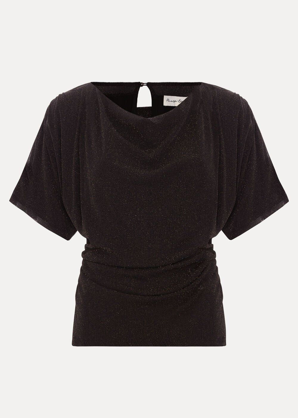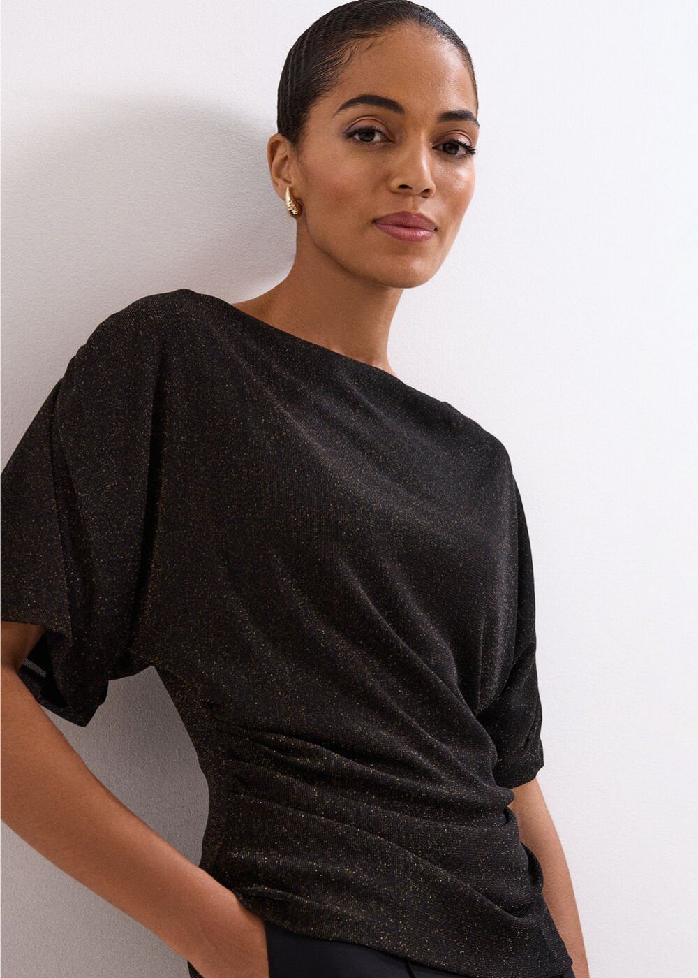 Every wardrobe needs a go-with-everything evening top. Featuring a modern slash neckline, a sophisticated draped silhouette and specks of bronze shimmer to catch the eye. This versatile style can be worn with trousers or skirts for an effortless but high-impact evening look.