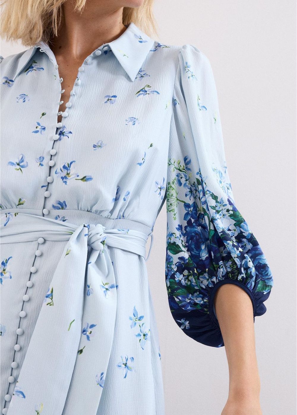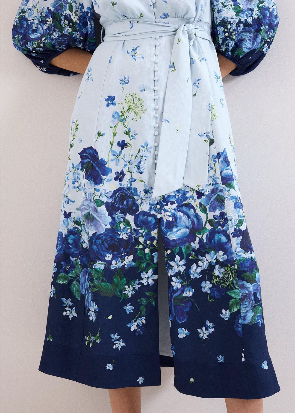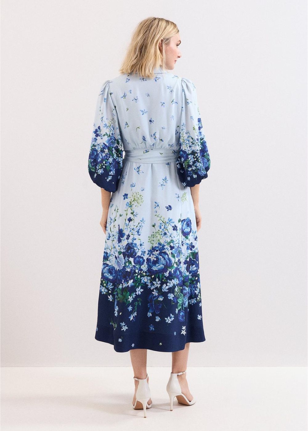 Encapsulating spring, this gorgeous blue shirt dress is designed in a timeless midi silhouette and features a cascading floral print, hand-painted in our London studio. With gorgeous, covered buttons, blouson sleeves and a matching tie belt, style with heels and a clutch for your spring/summer events or wear with flats for an elevated everyday look.