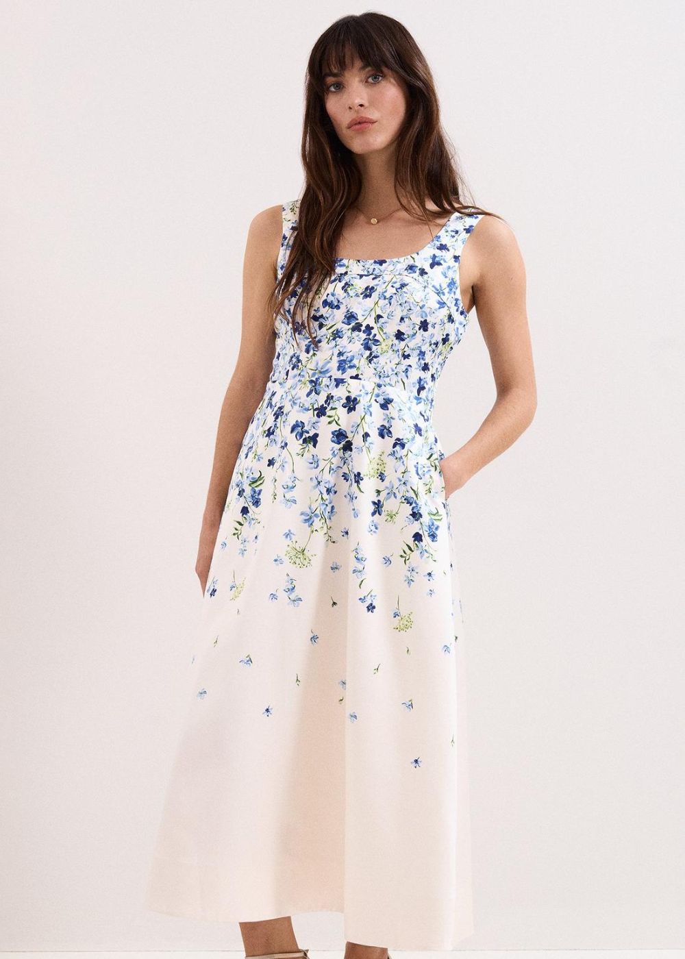This dress defines understated elegance. In a luxurious satin, this cream midi dress is designed in a romantic A-line silhouette with a timeless square neckline and scooped back. Featuring a delicate floral print in soft blues with hints of pale green, style this dress with matching accessories for a radiant event look you’ll feel amazing in.