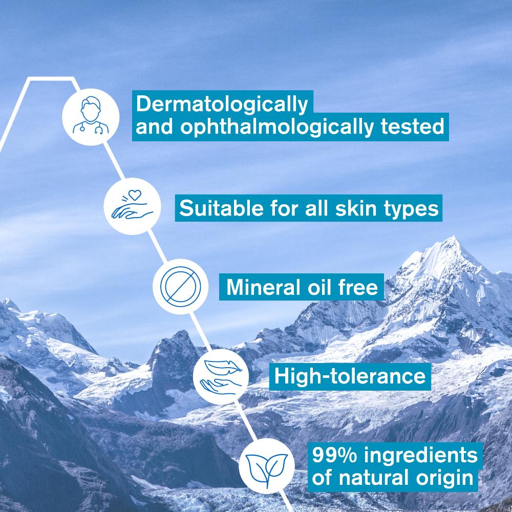 99% ingredients of natural origin — biodegradable formula — Fruity, floral fragrance with tangy notes — Innovative texture with a non-greasy finish — Waterproof effectiveness — 3 vegetable oils and derived from Vitamin E — Tested under dermatological and ophthalmological control