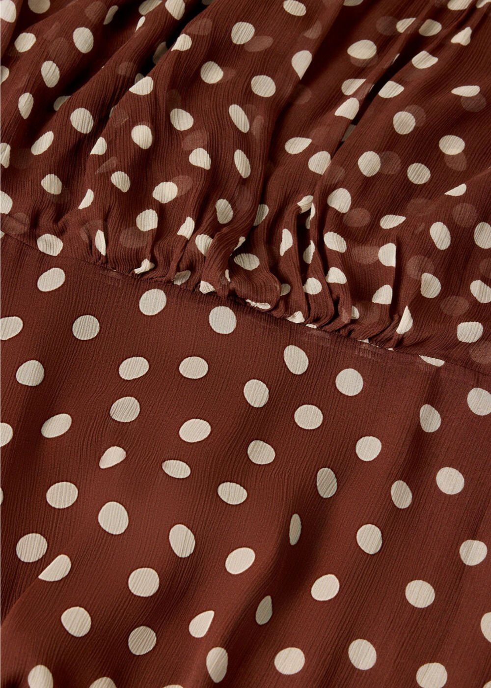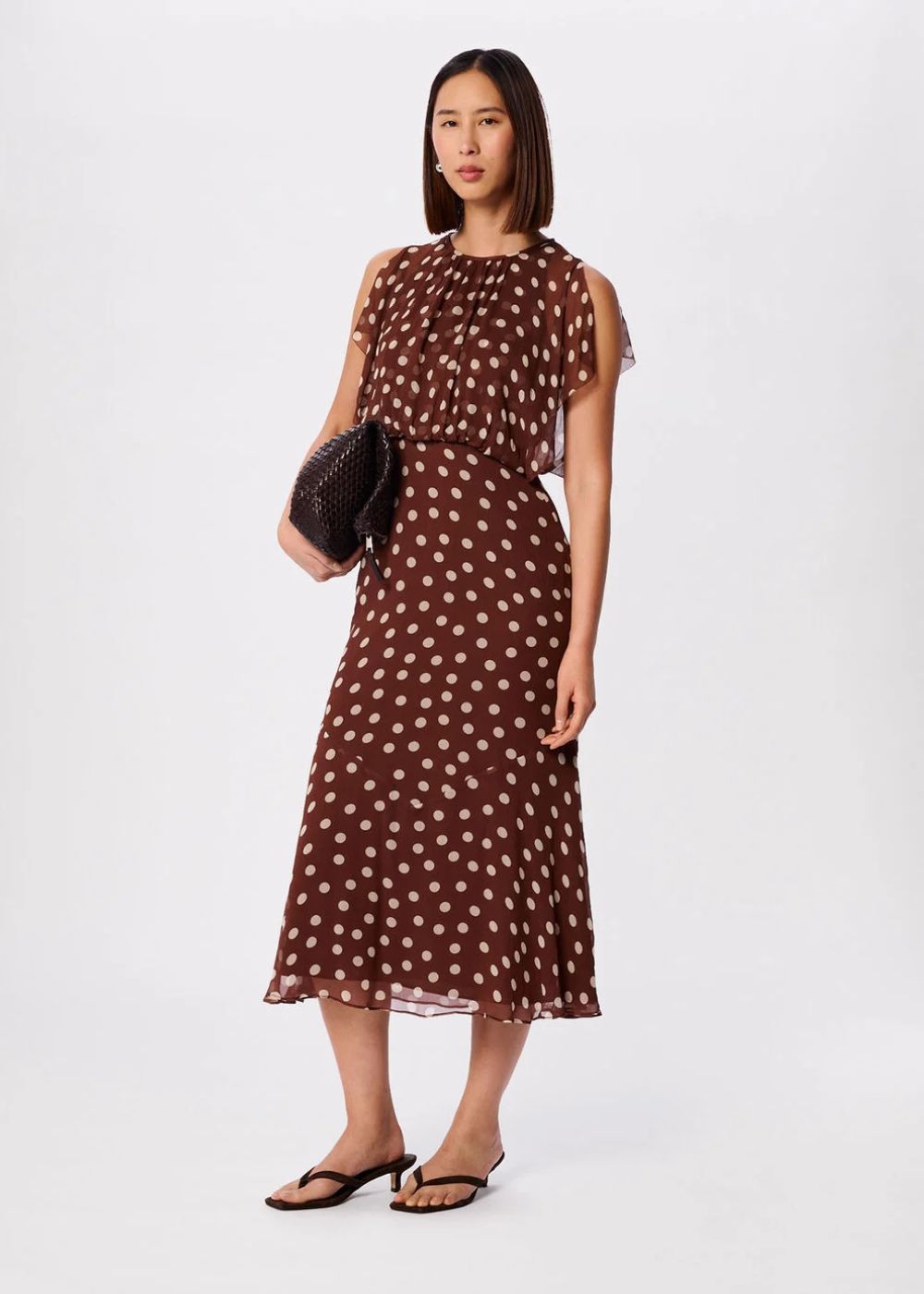 With a classic and timeless print, our Polka Dot Midi Dress is made for the brighter days ahead. Perfect for everything from lunch dates to daytime celebrations, it’s a guaranteed winner. In a warm brown shade with contrasting dots, the dress is cinched at the waist and features a round neckline with short, open sleeves that subtly reveal the shoulders. Crafted with two layers, it combines a brown lining with a sheer polka dot overlay.
